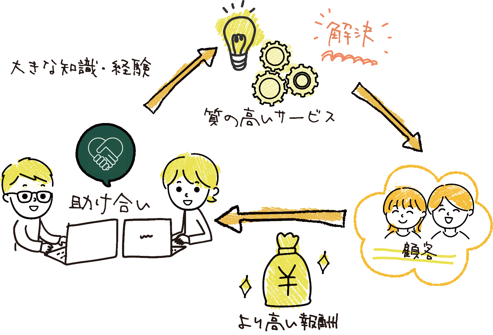 つまり、エンジニア一人ひとりが限られた自分の知識・経験ではなく、共同体の大きな知識・経験を顧客に提供することで、